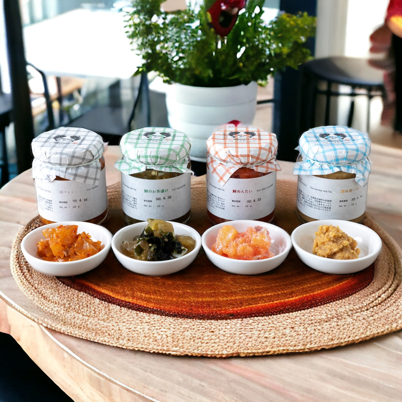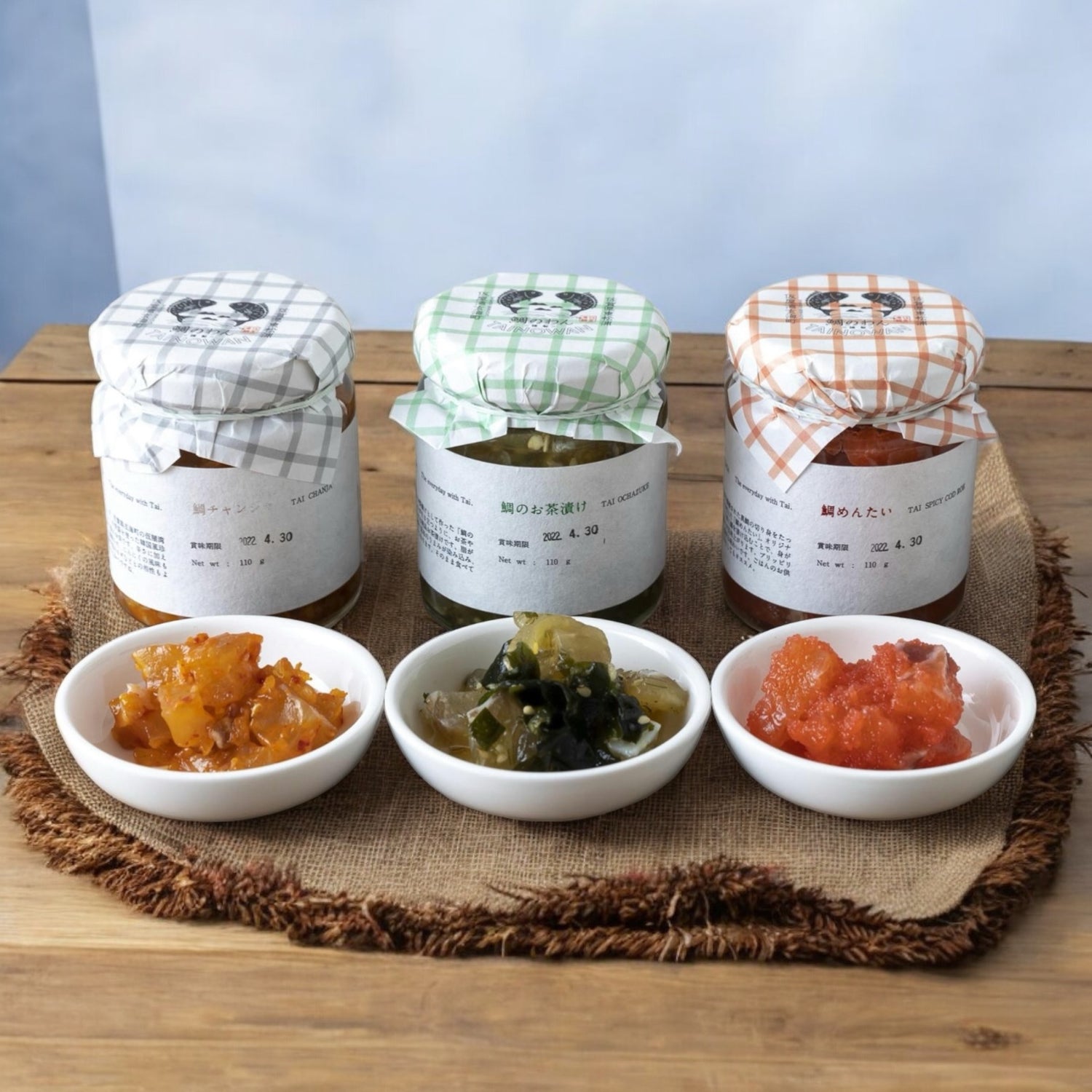 プリプリとした歯ごたえと甘みやコクなど、真鯛そのものを味わって頂けるよう、贅沢にザクッと大切りした真鯛切り身。その真鯛にまろやかな味噌とバターをブレンドしてみたり、真鯛とめんたいこを楽しめるように混ぜ合わせたり、あるいは韓国の塩辛、チャンジャを足したり。贅沢にお湯をかけるだけで楽しめる鯛茶漬けも開発しました。