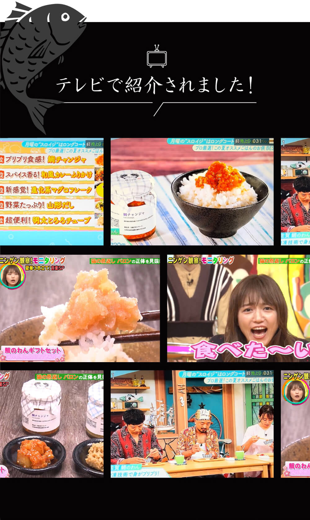 〇2023年8月に関西テレビで鯛チャンジャが紹介されました。〇「おとりよせネット」ベストお取り寄せ大賞2023で、ごはんのお供部門で銀賞の受賞を頂きました。〇おとりよせネット「お取り寄せの達人」が薦める「お取り寄せランキング2023」第1位:鯛のわん「(鯛のご飯のお供)」頂きました。〇『文藝春秋』2023年11月号(文藝春秋)に掲載されました。〇『Hanako』2023年11月号(マガジンハウス)のパン特集で、パンのお供として掲載されました。〇『最強のお取り寄せ2024』(ぴあ・12月発売)の巻頭特集「達人のおすすめ」ページに掲載されました。〇『食べログマガジン』で“〈食通のふるさと納税〉「東京最高のレストラン」編集長がリピートする「奇跡のご飯のお供 4種」”として掲載されました。〇2024年2月TBS『ニンゲン観察!モニタリング』で紹介されました。〇2024年4月テレビ東京『なないろ日和』鯛チャンジャが紹介されました。〇2024年5月日テレ『ZIPの水トあさ美と一緒にあさご飯』に鯛チャンジャが紹介されました。〇2025年8月28日にKBC九州朝日放送 「アサデス。7、九州・山口逸品ハンター」で鯛のわん出演させていただきました‼ KBC「アサデス。7」公式 Instagramでも詳細をご覧いただけます。〇2025年9月15日放送のZIP!水トあさ美と一緒にあさごはん!今度は鯛めんたいが紹介されました!!